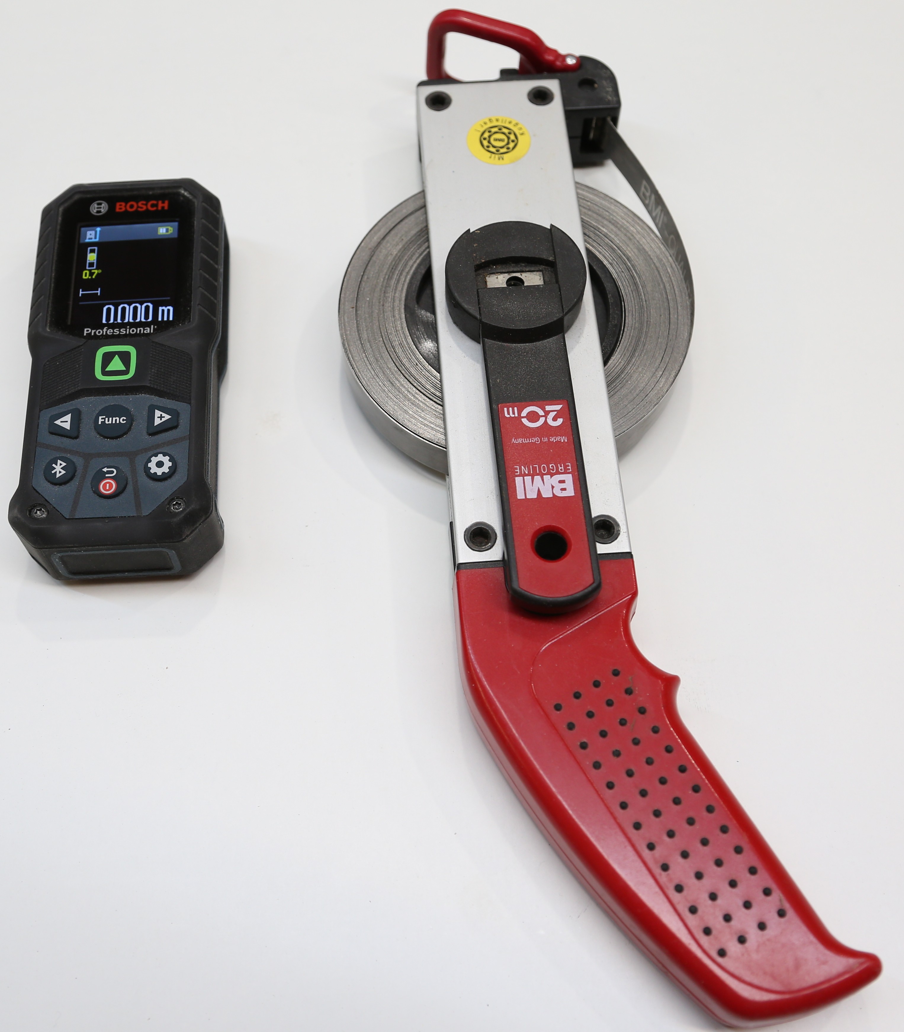 Zusätzlich enthalten: 20 m Stahlmaßband für klassische Längenmessungen, z. B. bei schlecht zugänglichen oder reflektierenden Oberflächen.