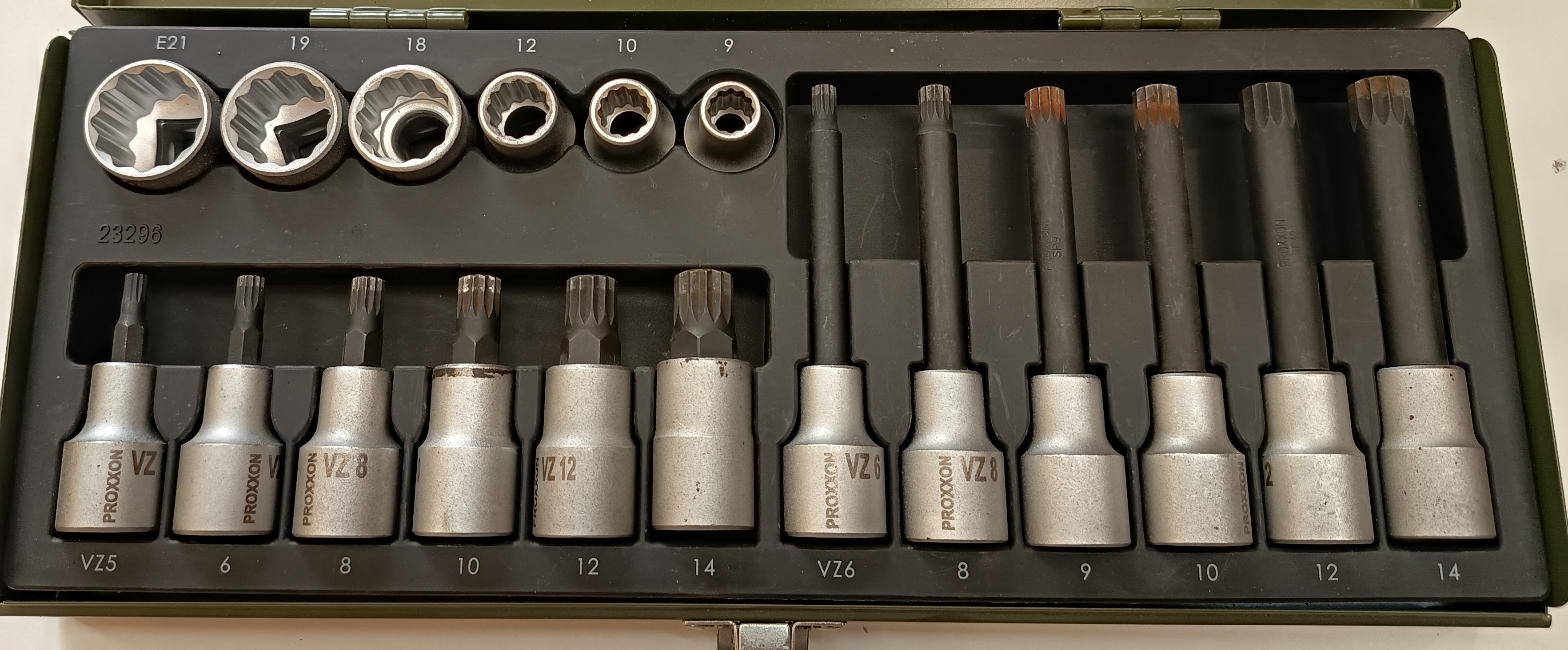 - Umfangreiche Ausstattung: Das Set enthält 18 Teile, darunter Schraubereinsätze in normaler Länge (55 mm) von 5 bis 14 mm, extralange Einsätze (100 mm) von 6 bis 14 mm sowie von außen fassende 12-kant Einsätze von 9 bis 21 mm.